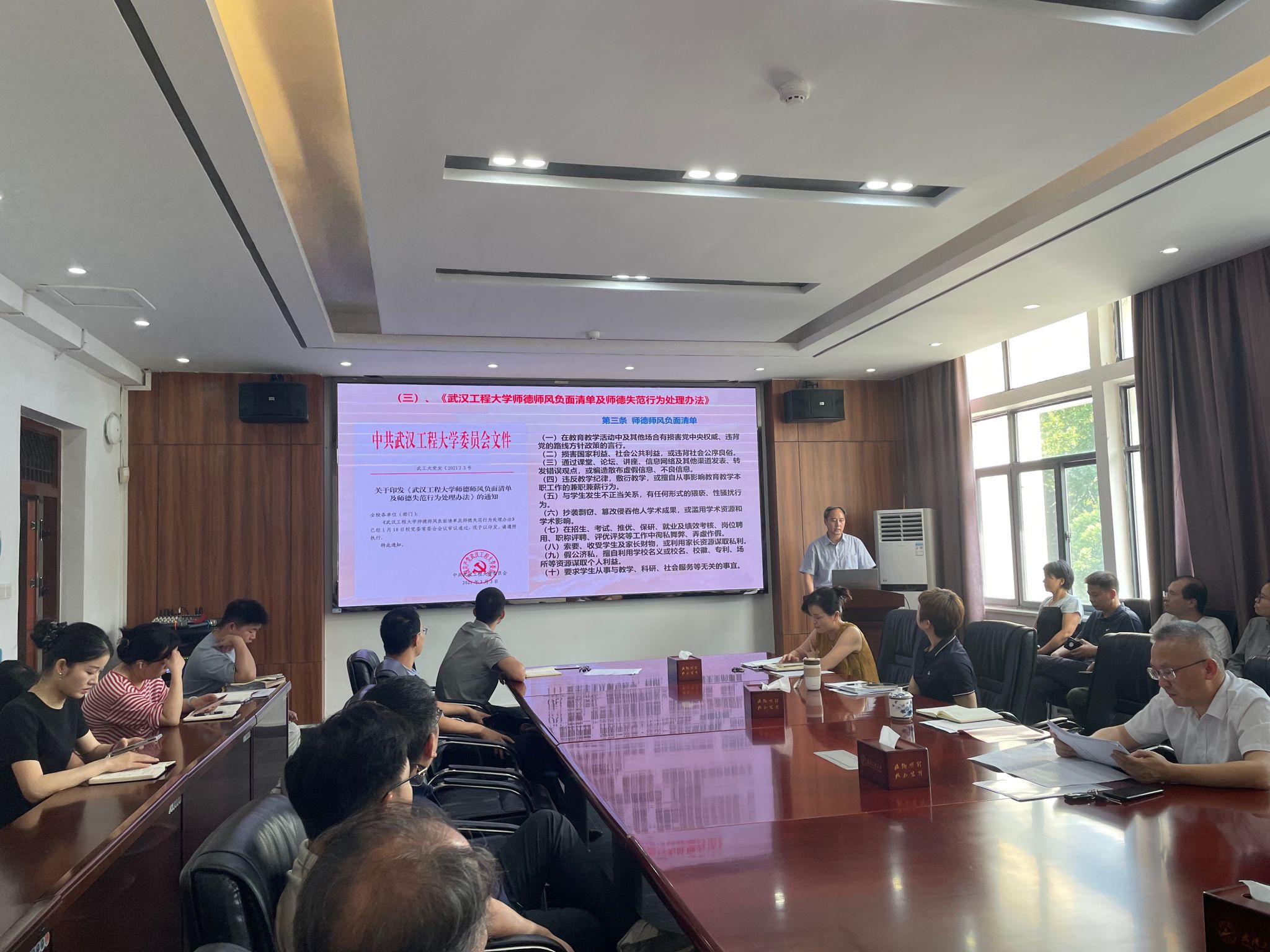 江本武书记结合学校2025年关于师德师风主题宣传教育月活动的安排,与全体教师一起进行了集中专题学习。通过回顾《新时代高校教师职业行为十项准则》《高等学校教师职业道德规范》《武汉工程大学师德师风负面清单及师德失范行为处理办法》等,让老师们知道哪些事情可以做,哪些事情不能做。同时通过教育部公开曝光的第十三批7起违反教师职业行为十项准则典型案例,时刻提醒老师做到知敬畏、存戒惧、守底线,在日常教书育人的过程中牢记新时代教师的荣誉与使命,警钟长鸣。