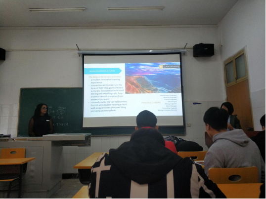 在武昌校区2教314教室举办与澳大利亚科廷大学的留学宣讲会,采矿工程专业16、17级学生积极参加,澳大利亚科廷大学国际处国际合作部负责人Saba Amanuel就采矿专业学生到科廷大学交流访学的相关事项与大家进行了详细、深入的交流。