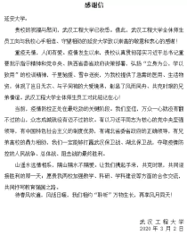 在抗击新冠肺炎的关键阶段,延安大学全体师生向奋战在抗疫一线的武汉工程大学师生及家属捐赠了防疫物资消毒液10箱,延安洛川苹果350箱等生活物资,并带来了诚挚的问候。