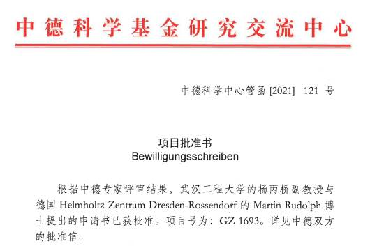 杨丙桥副教授与德国亥姆霍兹德累斯顿罗森多夫研究中心Rudolph Martin博士联合申报的“德国优秀青年基金项目(长期)”正式获批立项,项目获批经费44万,项目编号GZ1693,该项目研究周期三年。