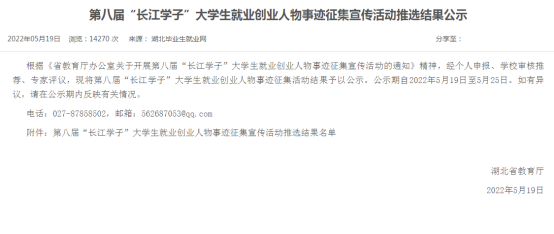 近日,从湖北省教育厅获悉,湖北省第八届“长江学子”大学生就业创业人物事迹征集活动评选结果揭晓,天天足球直播(中国)官方网站