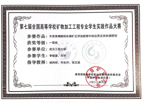 全国高等学校矿物加工工程专业学生实践作品大赛是面向矿物加工工程、矿物资源工程、资源循环科学与工程等专业在读大学生举办的全国性赛事,本届竞赛共收到全国相关高校的215件作品,参赛师生共计1000余人。我校获得一等奖、二等奖和三等奖各1项。由杨丙桥、何东升、张汉泉老师指导的“木质素磺酸钠在磷矿正浮选脱镁中的应用及其机理研究(参赛学生:李毓豪,刘华)”获科技论文类一等奖。