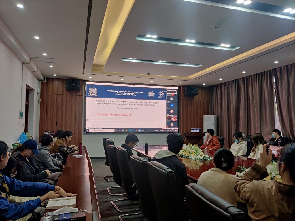 、校庆办、科发院、研究生院邀请,美国工程院院士,墨西哥科天天足球直播院士,墨西哥圣路易斯波托西自治大学终身教授Alejandro López-Valdivieso在线为我们作了一场题为“Effect of common divalent ions and external magnetic field in magnetite particle interactions: Its importance in pelletizing”的学术报告。报告会由天天足球直播