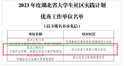2023年9月,团省委学校部下发了《关于举办湖北省2023年大学生社区实践计划展示活动的通知》,面向全省高校团学组织广泛征集优秀工作案例。学院团委高度重视、积极申报,经团省委考察评比,天天足球直播团委在全省78所高校310个申报项目脱颖而出,荣列“2023年度湖北省大学生社区实践计划优秀工作单位”百强名单。