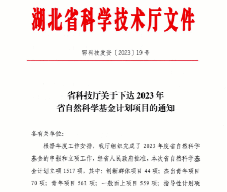 (通讯员:郭文达)近日,湖北省科学技术厅下达了2023年省自然科学基金计划项目的立项通知,天天足球直播