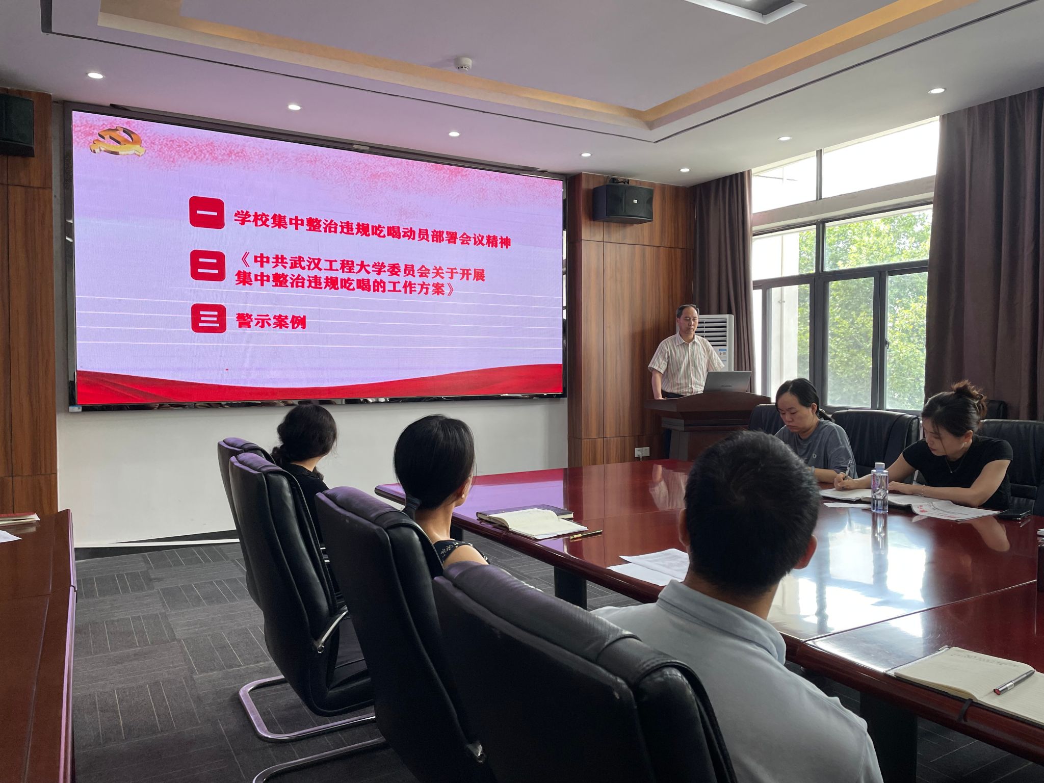 天天足球直播党委书记江本武传达了学校关于集中整治违规吃喝动员部署会会议精神和相关文件精神,解读了《中共武汉工程大学委员会关于开展集中整治违规吃喝的工作方案》,对天天足球直播集中整治违规吃喝工作进行部署安排。他强调,各教研室、办公室全面自查自纠,党员干部要对照纪律要求,认真学习领会相关纪律法规和本次集中整治的具体要求,自觉抵制违规吃喝。