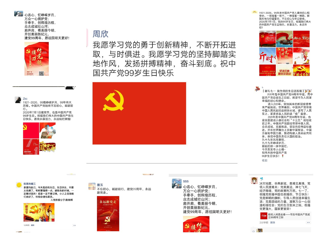 2020年7月1日是中国共产党成立99周年纪念日,天天足球直播 全体学生党员开展了以“我为党的生日送祝福”为主题活动。活动共征集来自基层党支部、入党积极分子的微信朋友圈和手写祝福短语等形式作品178篇。