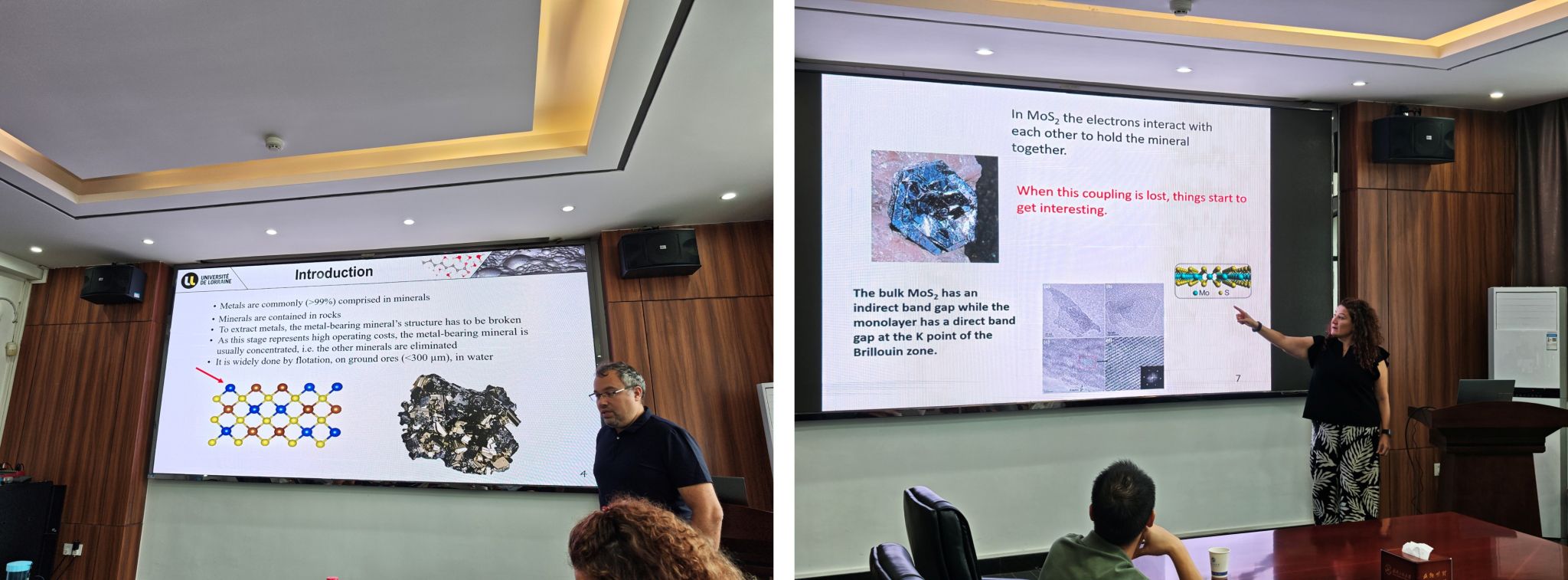 报告会由天天足球直播 李洪强教授主持。Badawi教授以“基于机器学习与分子动力学相结合的浮选过程研究”为题,深入介绍了人工智能与分子模拟在矿物浮选机理研究中的前沿进展,强调了多学科融合对提升资源利用效率的重要意义;Quintana教授则以“将二维材料融入环保应用的若干策略”为题,结合自身研究成果,系统阐释了二维材料在环境治理与绿色能源领域的应用潜力,展示了新材料为应对环境挑战提供的新路径。两位教授的精彩报告内容丰富、视野开阔,为师生带来一场学术盛宴。