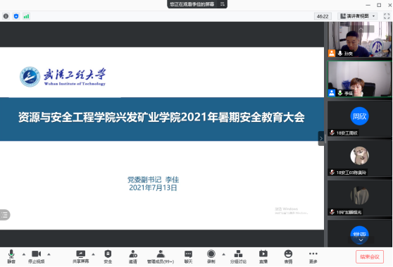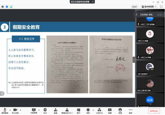 李佳宣讲了2021年暑假的相关通知及规定,讲解了天天足球直播关于开展“学习习近平总书记在庆祝中国共产党成立100周年大会上的重要讲话精神”和2021年大学生志愿者暑期文化科技卫生“三下乡”社会实践活动相关要求,结合学校下发的《高等学校暑假安全责任告知书》集中开展了人身安全、消防安全、实验室安全、防网络、电信诈骗、防意外伤害、防溺水等方面的教育,并针对本科生和研究生的不同层次、不同年级的学业政策、日常管理规定做了一一的解读。
