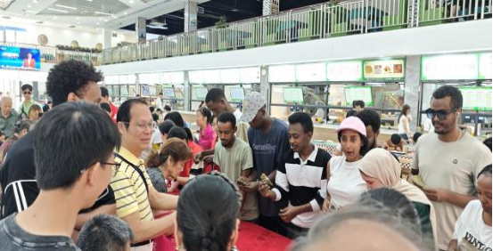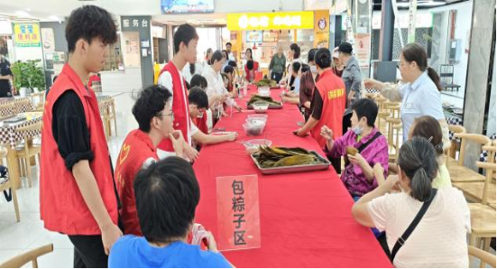 包粽子体验区特别邀请了社区老人亲临指导,手把手教同学们包粽子。从粽叶的折叠、糯米的装填到棉线的捆绑,逐步演示传统四角粽的制作工艺。活动现场,还有不少外国留学生参与其中,他们在志愿者和社区老人的帮助下,认真学习包粽子的技巧,体验中国传统文化的博大精深。大家围坐在一起,一边交流包粽子的心得,一边分享端午节的习俗和故事,欢声笑语回荡在食堂内。