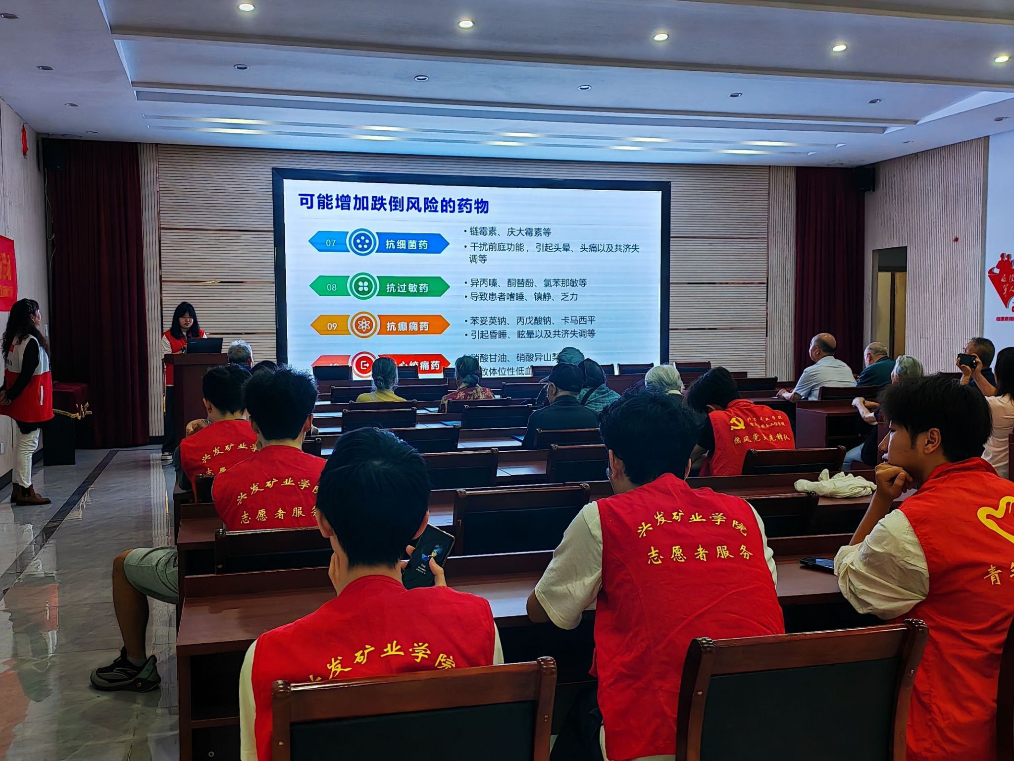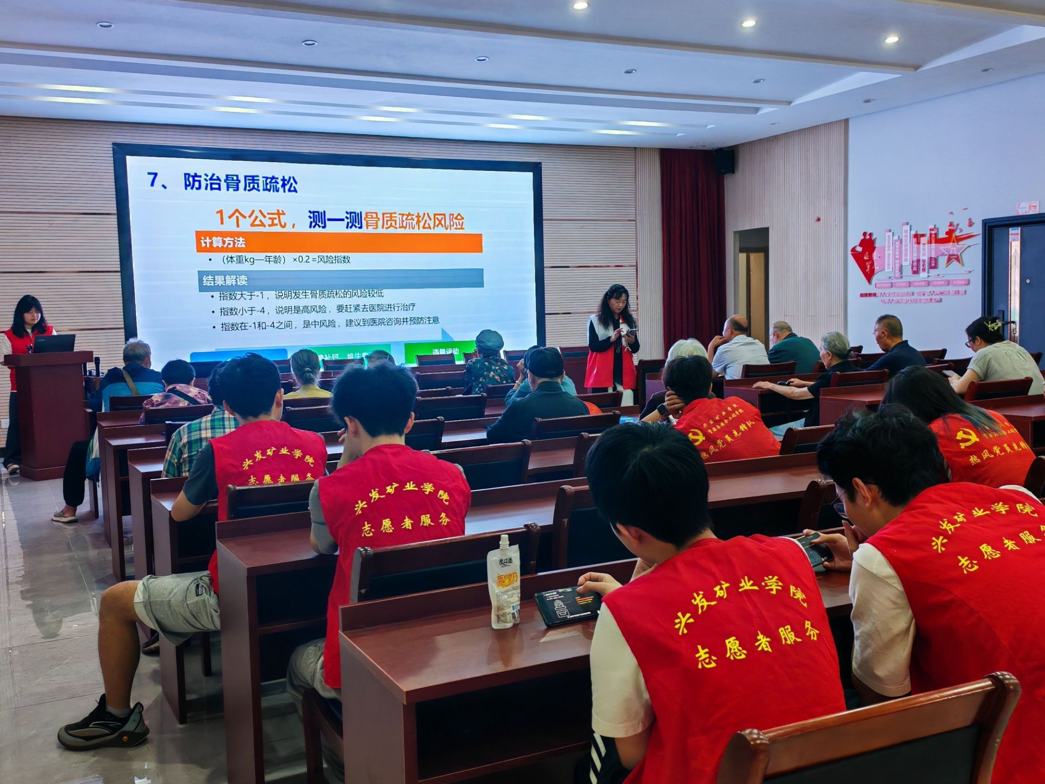 活动现场,志愿者团队采用“PPT可视化讲解+现场实操演示”的形式,围绕“跌倒的医学定义与危害”“运动场景防跌倒技巧”“慢性疾病管理策略”“居家环境安全改造”“适老化辅助工具的科学选用”五大核心内容展开递进式宣讲。五场活动分为技能实训、风险评估、居家防护三大板块:技能实训中,志愿者以“理论解析+场景还原”阐释跌倒危害,现场教学“防跌倒三式”并进行一对一动作矫正;风险评估专场,运用“(体重/kg-年龄)×0.2=风险指数”模型为20余位老人测算骨质疏松风险,李奶奶分享跌倒经历引发强烈共鸣;居家防护宣讲以“地不湿、鞋不滑、扶手通”为准则,演示家居安全改造技巧,指导老人选用适配辅助工具。