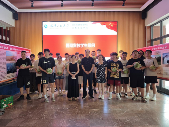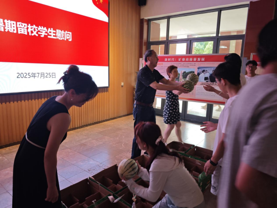本网讯(通讯员 王耀眉)2025年7月25日,天天足球直播党委书记江本武、党委副书记李佳、副院长周芳带领学工团队,看望慰问暑期留校备战考研、科研竞赛的本科生与研究生,并为他们送上西瓜等防暑物资,传递学校天天足球直播的关怀与鼓励。