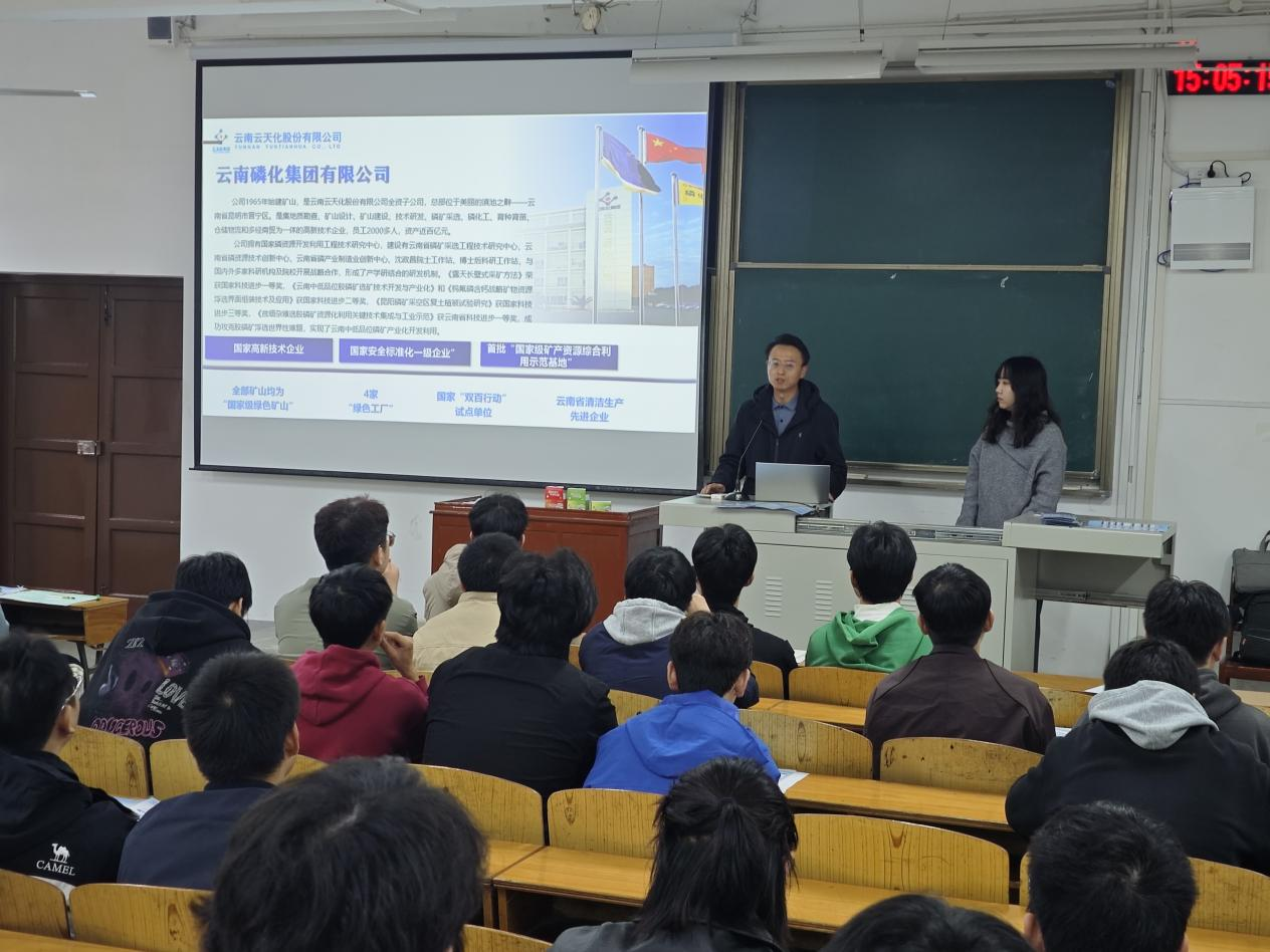 云南磷化集团作为国有大型现代化露天磷矿采选企业、国家重点化学矿山及国家级磷复肥磷矿采选基地,其企业实践与人才需求为在校学生提供了宝贵的专业参照。本次活动是天天足球直播落实“四导三进双导师”育人体系、强化职业与专业教育的重要举措之一,通过“企业专家进课堂”的方式,搭建校企“零距离”交流平台,切实增强学生的就业竞争力,全面推进毕业生更充分、更高质量就业。(审稿 李佳)