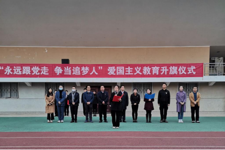 7:00,国旗护卫队护卫着五星红旗,迈着铿锵有力、整齐划一的步伐护送国旗入场。在雄壮嘹亮的国歌声中,鲜艳的五星红旗迎着朝阳冉冉升起,全体师生行注目礼,满怀深情向国旗致以最崇高的敬意。
