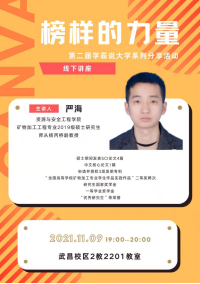 2021年保研到中南大学的2018级矿物加工工程专业本科生关智文、本科生国家奖学金获得者2018级安全工程3班黄敏、研究生国家奖学金获得者2019级矿物加工工程专业硕士研究生严海共3名同学作为分享嘉宾。