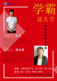 杜冰曾获得两次奖学金、优秀青年志愿者、三好学生、三好学生标兵、优秀毕业生,他从各个学科的不同学习方法和要求入手,分享了自己的学习经验。