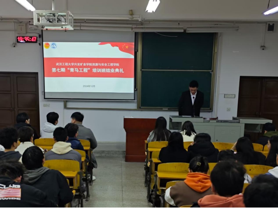 在武汉工程大学武昌校区W2101教室举行第七期“青马工程”培训班第四次授课暨结业典礼。出席典礼的嘉宾有团委指导老师耿胡锐、团委副书记(学生)乔仕元、团委暨学生会主席团全体成员、2024级全体新生。