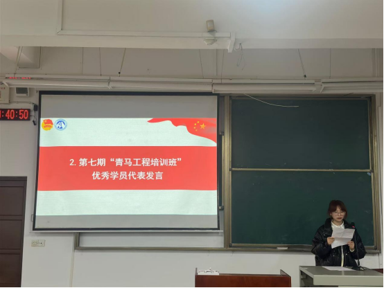 第七期“青马工程”培训班优秀学员代表李思含分享了在培训班的感受与心得,她表示通过此次培训班的学习,更加坚定了理想信念,明确了人生目标,提高了思想素质。她鼓励学员们勤奋钻研,勇于实践,坚定马克思主义信仰,提高政治觉悟,做马克思主义的坚定传播者,以“青马精神”为指引,在时代的浪潮中奋勇前行。