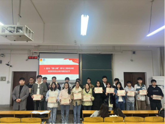 团委副书记(学生)乔仕元宣布优秀学员名单。团委指导老师耿胡锐为第七期“青马工程”培训班优秀学员颁发优秀学员证书。