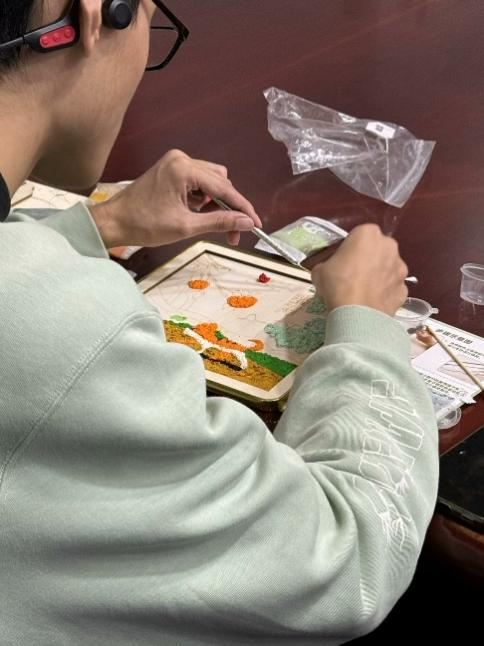 随后,进入手工制作环节。此次活动特别准备了玻璃灯画、马赛克杯垫以及非遗纸浆画三项内容供同学们选择体验。每一种手工制品都蕴含着深厚的文化底蕴,参与者们分组合作,用心地将材料组合成一幅幅精美的作品,每一笔、每一画都倾注了他们对传统文化的热爱。