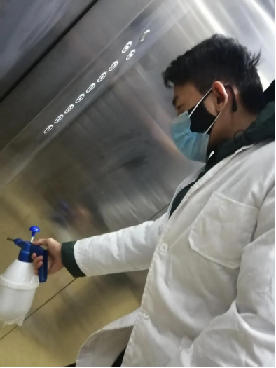 临近春节,可村子里的街上已经没人来往了,许多曾经繁华热闹的地方,也都变了模样。根据思贤村的防疫要求,所有村庄都实行封闭管理。郑月鹏作为消毒志愿者的一员,每天早上六点起床,戴好所有的装备以及做好自身的防护措施后,就在小区楼道里来来回回的喷洒消毒。带着口罩,拿着喷雾器,给他的工作增添了难度,但他仍然认真给每个楼层的消毒,角落里的消毒工作最为重要也极具困难性,郑月鹏必须把“仰头、弯腰、蹲下”这些再平常不过的动作重复几十遍,一天下来就已经腰酸背痛了。可是当郑月鹏看到村民们因为消过毒的楼道而感到安心和高兴,他便不觉得自己很累,因为他都是在做有价值的事。