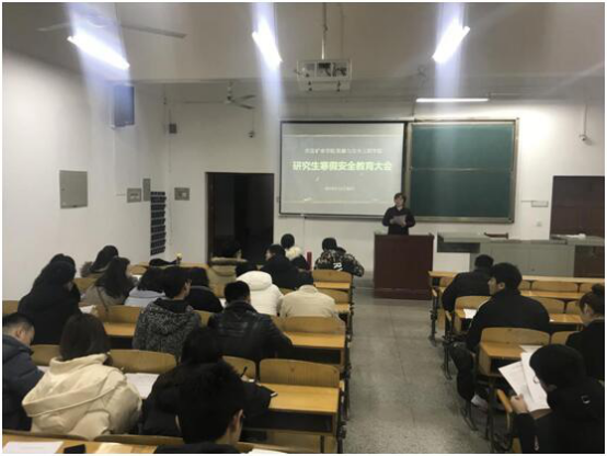 在研究生安全教育会上,李佳以近期高校实验室安全发生的安全事故为例,着重强调学生宿舍、实验室安全方面的隐患问题,并与在场学生集中学习了学校下发的《武汉工程大学研究生安全管理办法(实行)》、《武汉工程大学研究生校外培养管理办法(试行)》等文件。